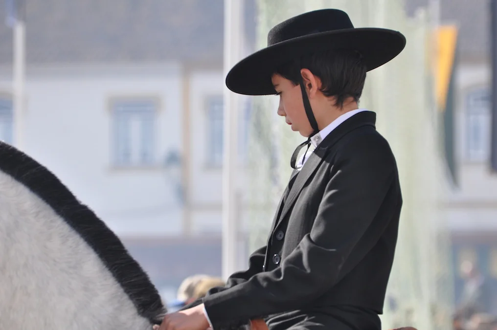 You see it at the Golegã fair — where young riders guide seasoned Lusitano stallions through intricate movements, sometimes riding alongside their grandfathers, each in full traditional attire. A boy may perform pirouettes with ease, while his father drives an elegant carriage nearby. Young girls ride side-saddle in beautifully embroidered skirts, embodying both grace and strength.